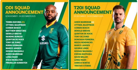 भारत के खिलाफ वाइट-बॉल मुकाबले से पहले साउथ अफ्रीका ने अपनी टीम का ऐलान कर दिया है। टेस्ट कप्तान टेम्बा बावुमा वनडे में भी कमान संभालेंगे, जबकि टी-20 की बागडोर ऐडन मार्करम के हाथों में होगी।