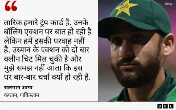 BBCप्रेस कॉन्फ़्रेंस में स्पिनर उस्मान तारिक़ के बॉलिंग एक्शन के बारे में पूछने पर सलमान आगा ने कहा है कि तारिक़ उनके ट्रंप कार्ड हैं.