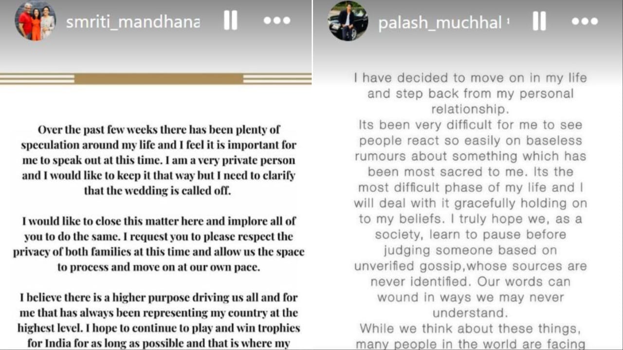 स्मृति और पलाश ने अपने-अपने इंस्टाग्राम अकाउंट के जरिए खुद की शादी के रद्द होने की जानकारी दी. उन्होंने कहा कि बीते कुछ समय से उनकी शादी को लेकर अटकलों का बाजार गर्म था, जिसके बाद बोलना जरूरी था. दोनों ने गोपनीयता का सम्मान करने की भी अपील की. (Photo: Instagram)