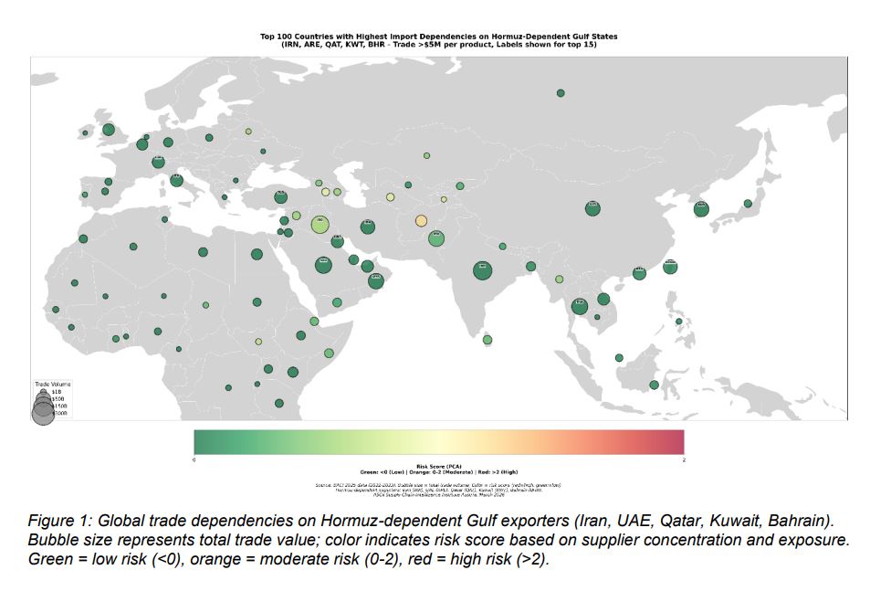 Their modelling focused on five Gulf states — Iran, Qatar, Kuwait, Bahrain, and the United Arab Emirates — all of which rely entirely on the Strait for exports.