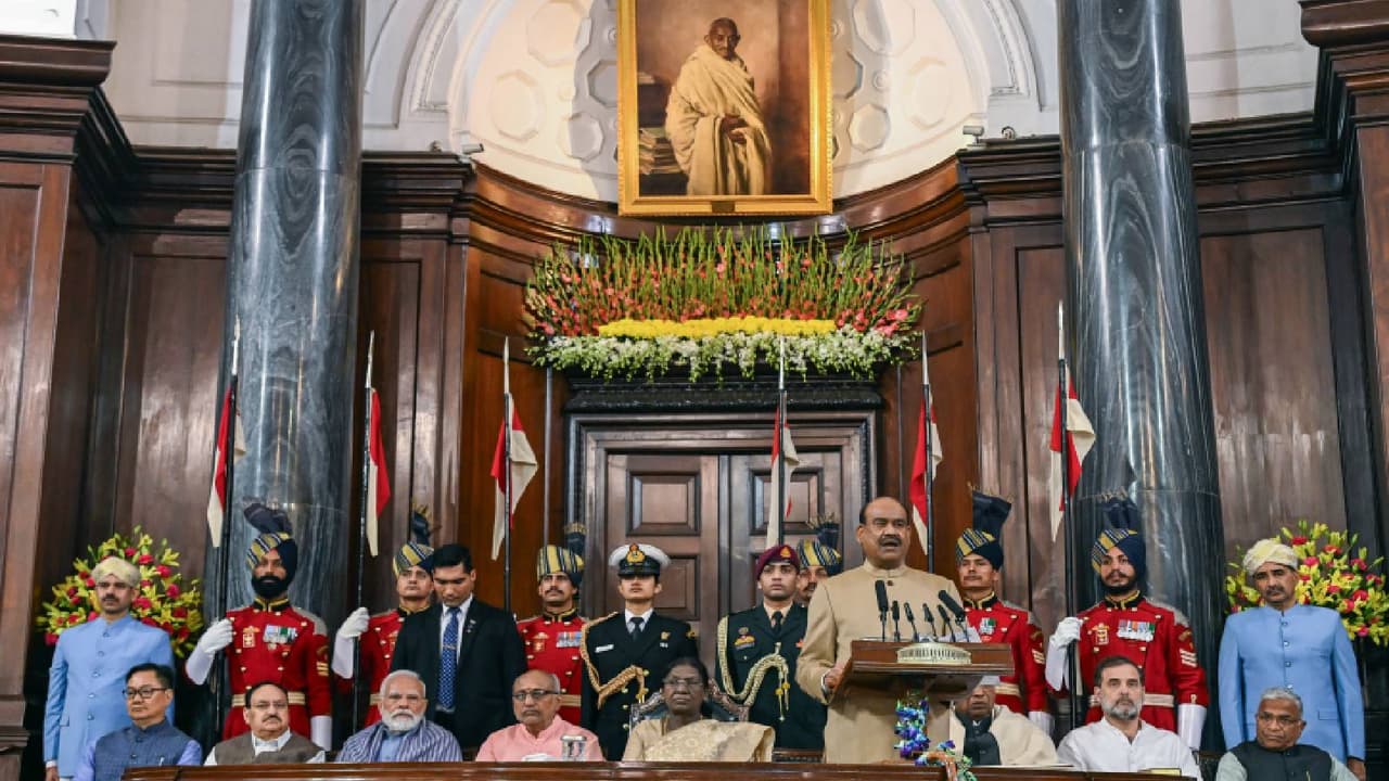 Lok Sabha Speaker Om Birla speaking during the Constitution Day (Constitution Day) celebrations at the Constitution House in New Delhi on Wednesday. Vice President C.P. Radhakrishnan, Prime Minister Narendra Modi, Rajya Sabha Deputy Chairman Harivansh Narayan Singh, Union Health Minister JP Nadda, Union Parliamentary Affairs Minister Kiren Rijiju, Congress President Mallikarjun Kharge and Leader of Opposition in Lok Sabha Rahul Gandhi are also present.