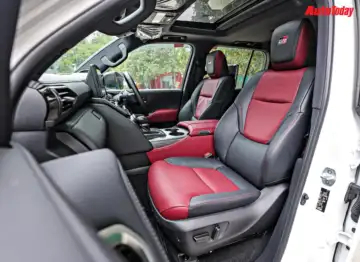 In the modern world of display dominated cabins, the Land Cruiser takes quite the balanced step. Large infotainment display, but replete with a bank of switches for climate control and all the important off-road tech.One of the key reasons that the Land Cruiser in the past few decades elevated itself to the pinnacle of SUVs is owing to the supremely luxurious cabin and its comfort quotient, and that continues with this LC 300. The space is cavernous, and decked in premium leather upholstery, that in the GR Sport takes a sporty turn with the red and black dual-tone theme, with certain sportier looking elements such as the GR Sport logo on the steering and the start/stop button.