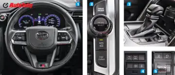 Nearly every function in the Toyota Land Cruiser GR Sport is controlled by dials and buttons. The steering gets a GR logo at the bottom, and the steering mounted buttons serve as the controls for the ADAS and other systems.In a world where even key controls such as mirror adjustments and headlamps have moved to oversized infotainment displays, the Land Cruiser stays analogue, with enough buttons that it feels like an aircraft. There is a bank of toggles and switches for the 4-zone climate control, drive modes, terrain modes, and the extra off-road tech that the LC comes loaded with. I am especially a fan of the way the 4H and 4L toggle works, and for one, all the switches and buttons and dials feel extremely tactile, and this feeling of quality continues to almost every surface inside the cabin.