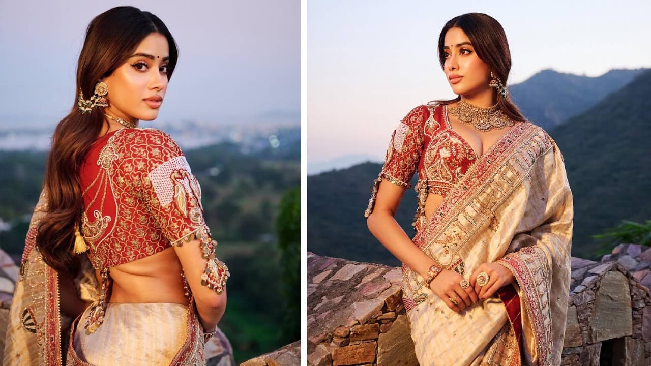 Jahnavi Kapoor is wearing ivory saree with red embroidered blouse. Sweetheart neckline blouse looks fancy. You can also get such blouse designs ready for a wedding function or any special party. You will also get such blouses readymade at low prices.
