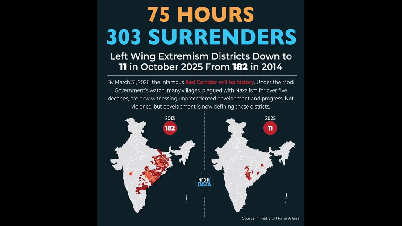 “The Constitution was in force in the rest of the country, but it was completely missing in the Red Corridor. And I say this with full responsibility that those who touch their head with Constitution book even today work day and night to protect these Maoist terrorists who do not believe in the Constitution at all,” he said. The Prime Minister said governments were elected, but they had no authority or recognition in the Red Corridor. “As evening fell, it became difficult for anyone to step outside their homes. Even those responsible for providing security to the public had to move around with security for themselves. Over the past 50-55 years, thousands of people have been killed because of this Maoist terrorism. Countless security personnel have fallen victim to it, and we have lost so many young lives,” he said.