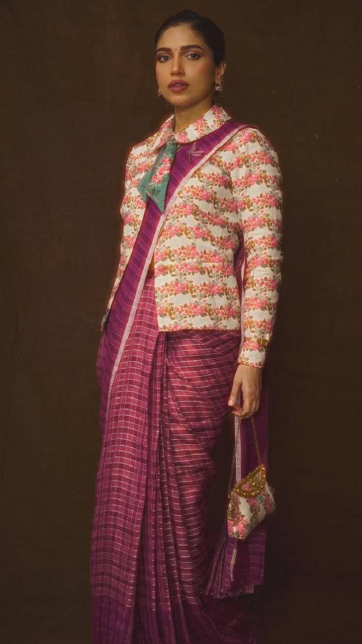 Bhumi Pednekar is wearing a checkered saree with a jacket-style blouse floral blouse. Teachers can choose such blouses for winters.