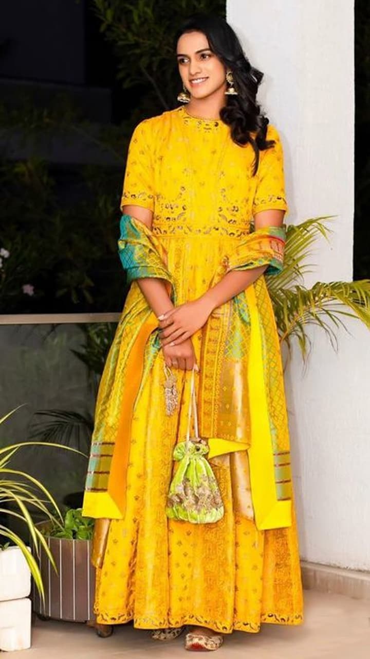 If you want a premium look in your wedding, then Kalidaar golden embroidery suit set is the best option. Carry it with a net dupatta like PV Sindhu. Flowy movement will look graceful with tall height.