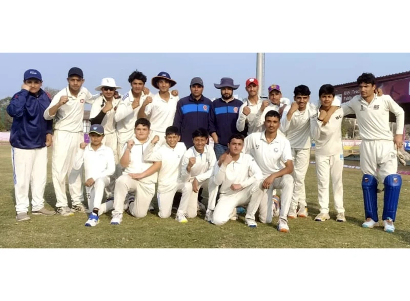 J&K U-14 team posing for group photograph. Excelsior Sports Correspondent JAMMU, Jan 22: Jammu and Kashmir secured a spot in the semifinals of the 69th National School Games U-14 Boys Cricket Tournament by defeating Delhi by 16 runs in a thrilling quarterfinal encounter at Sikar, Rajasthan.