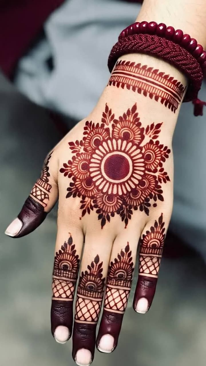 Such mandala art mehendi on back hand looks very cute on small hands. There is a mesh on the wrist and cut work on the fingers making a 3D flower in the middle, you should also try it.