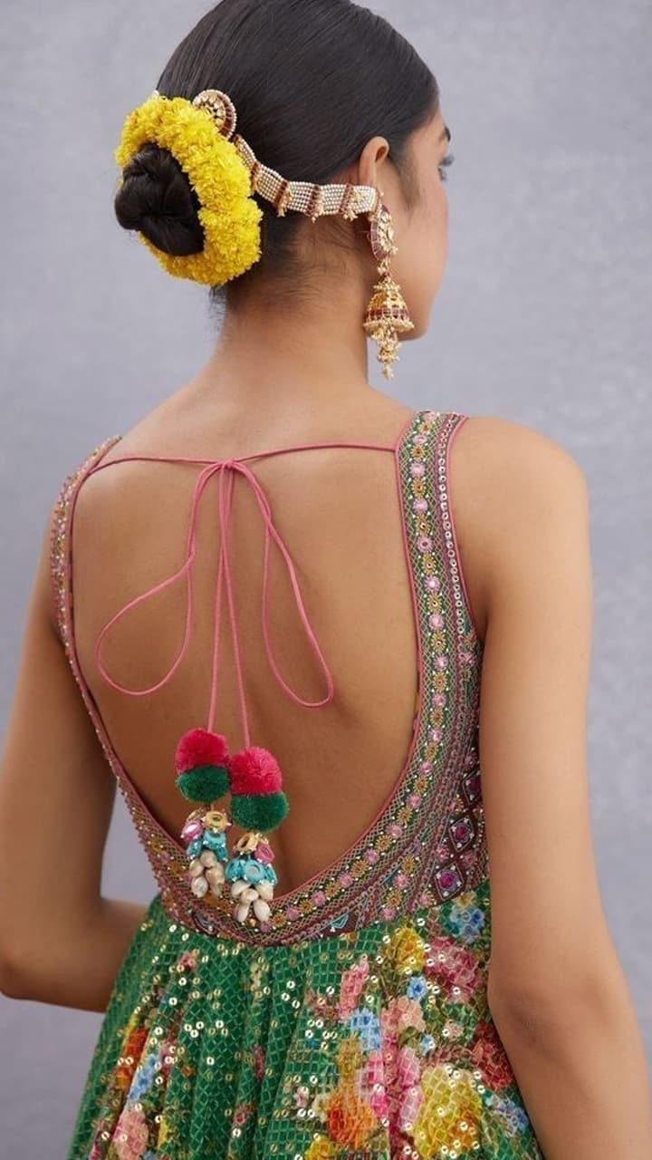 Pearl pendant is always evergreen. The latkan made with small or multi-layered pearls gives a very soft and royal look to the blouse. It looks very beautiful with silk, organza and net sarees.