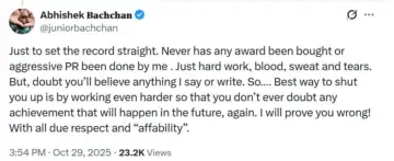 The controversy began when an X user, who describes himself as “journo, editor, trade analyst and cricket Ninja” in his bio, wrote, “As much as he’s an affable guy, I hate to say that professionally #AbhishekBachchan is the prime example of how buying awards and aggressive PR pushes can keep you relevant… even if you don’t have a single SOLO blockbuster in your career. He won an award for #IWantToTalk this year… A film which no one saw apart from a few PAID reviewers. And now I see all these tweets saying 2025 is HIS year. HILARIOUS !! (sic).”