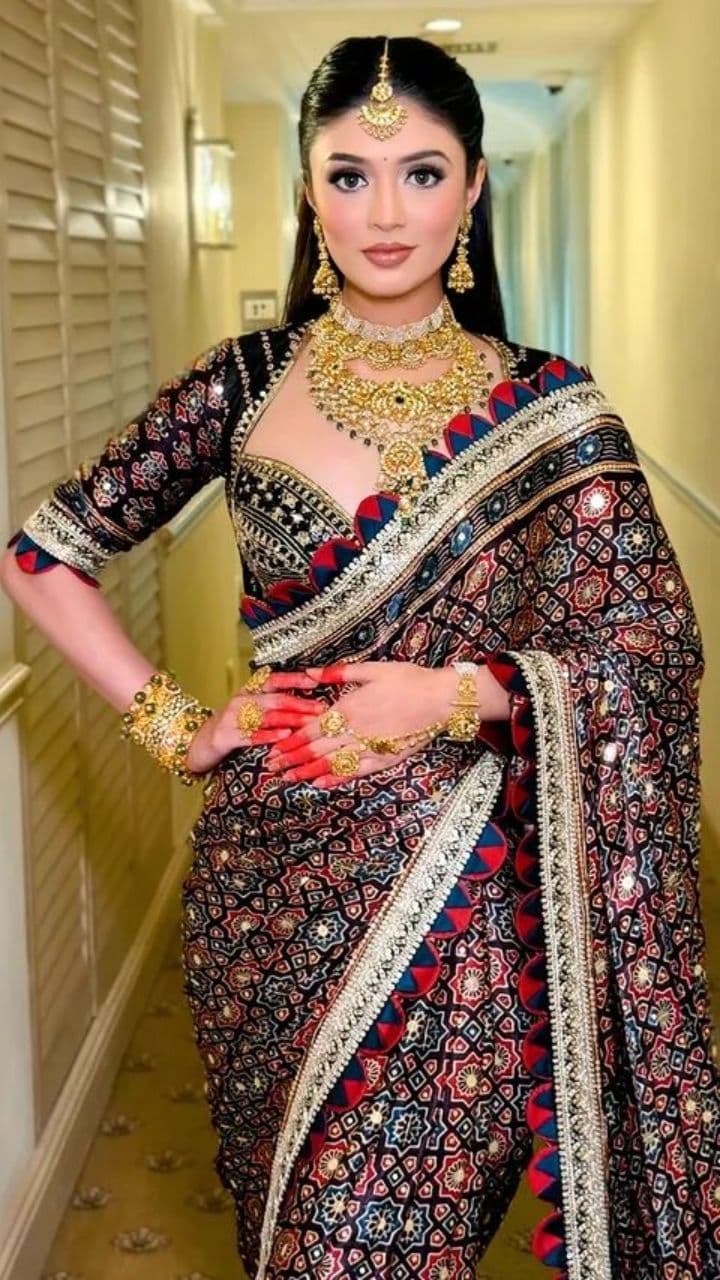 If you have taken a heavy Ajrakh blouse like this to wear in a wedding, then you can get the blouse made in a wonderful plunging neckline like this. If there is any fabric left in the blouse, make full sleeves also.