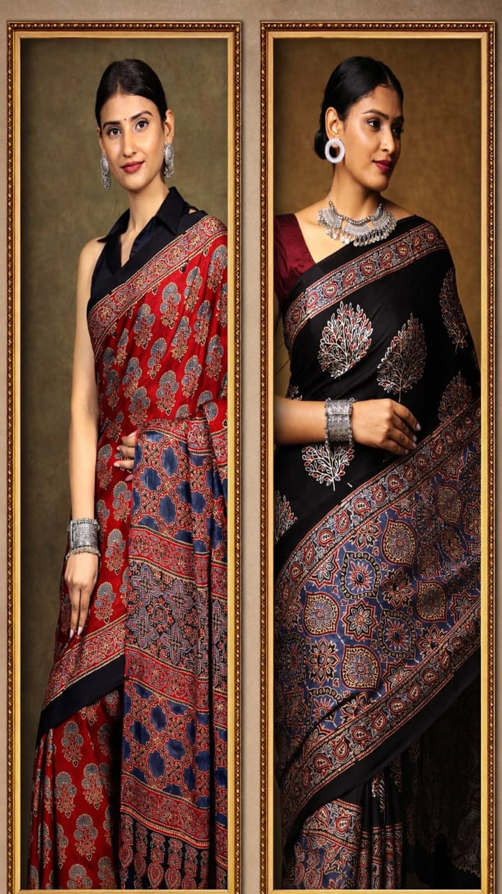 Ajrakh Modal Silk Saree: Mom and daughter same fashion, try Ajrakh print silk saree in summer. Ajrakh Modal Silk Saree Designs For Summer Mom And Daughter Ethnic Fashion