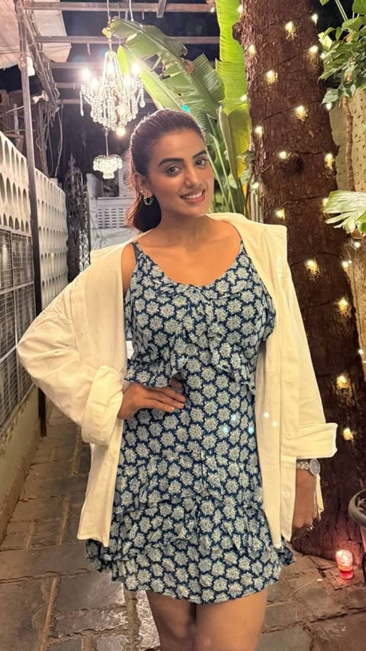 Akshara Singh has shared pictures of her stunning look from a corridor in a floral dress. Akshara looked very stylish in an oversized jacket with a floral print dress.