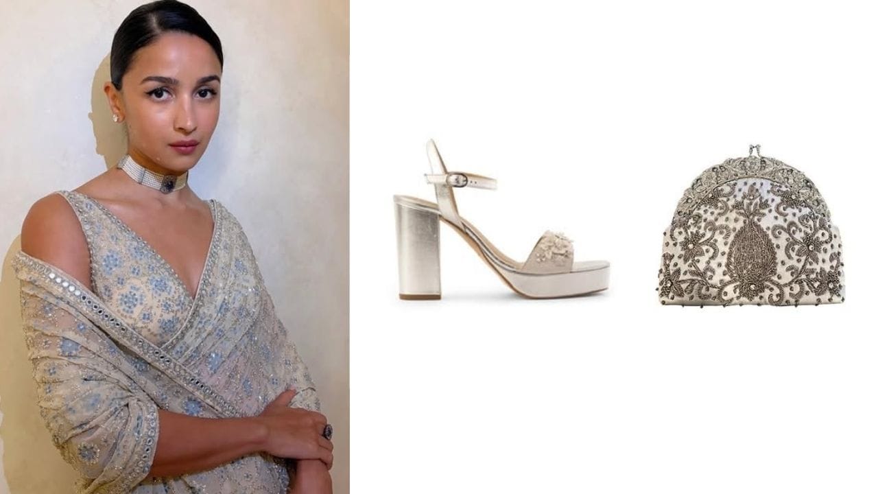The actor completes the outfit with the Kriti clutch by Meera Mahadevia. Intricately embellished, the clutch mirrors the artisanal language of the saree while adding texture and depth. Fizzy Goblet’s Petals & Prosecco heels bring a playful finish, offering comfort with a polished twist.