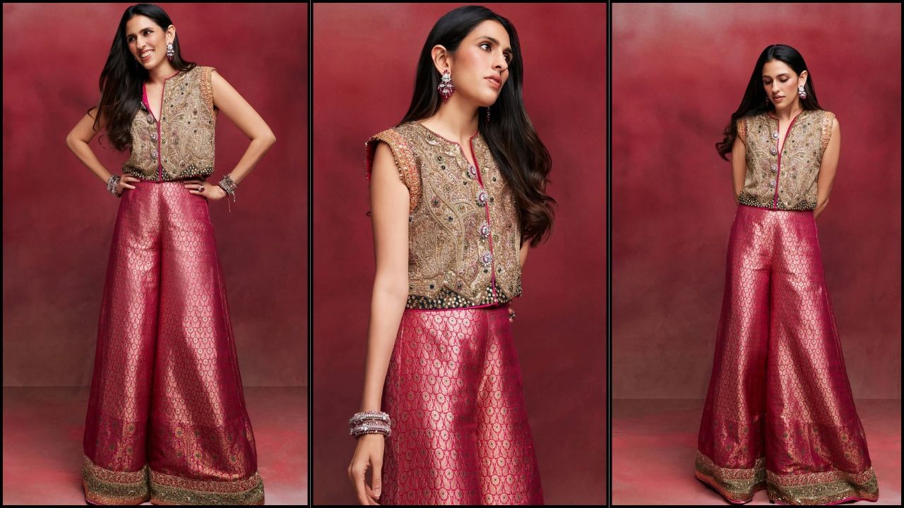 Instead of heavy lehenga or saree, Shloka Mehta chose a different and fresh style this time. She is wearing an Indo-western dress with sleeveless blouse. The blouse was beautifully embroidered with golden sequins and zari, which has a V-shaped neck design. The red border on the edges and big silver buttons were making her look more special. Instead of skirt or lehenga, she wore wide red palazzo pants in Banarasi silk palazzo, which had golden design and sequin border. This festive fusion look of hers looks absolutely perfect. Her look looks even more attractive in this Indo-Western dress.