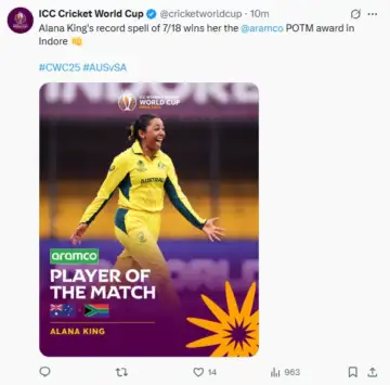 With the victory, Australia booked a semi-final date with India on October 30 at the DY Patil Stadium in Navi Mumbai. The defending champions topped the league stage with 13 points and a net run rate of +2.102. In the other semi-final, England will face South Africa on October 29 at the Barsapara Stadium in Guwahati.
