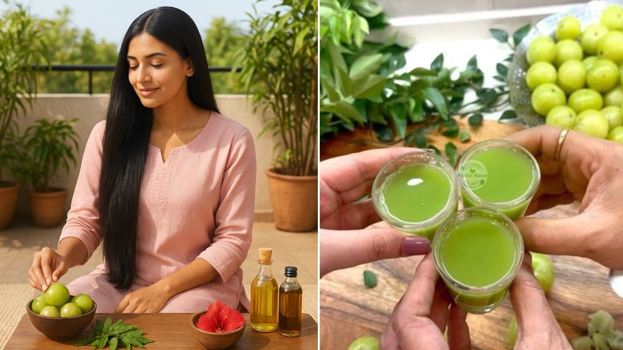 Prepare an Ayurvedic drink with amla juice, curry leaves, and methi water soaked overnight, and have it in the morning. Amla offers vitamin C, curry leaves support melanin and scalp health, and methi helps hydration. Regular intake supports stronger roots and reduces fall.
