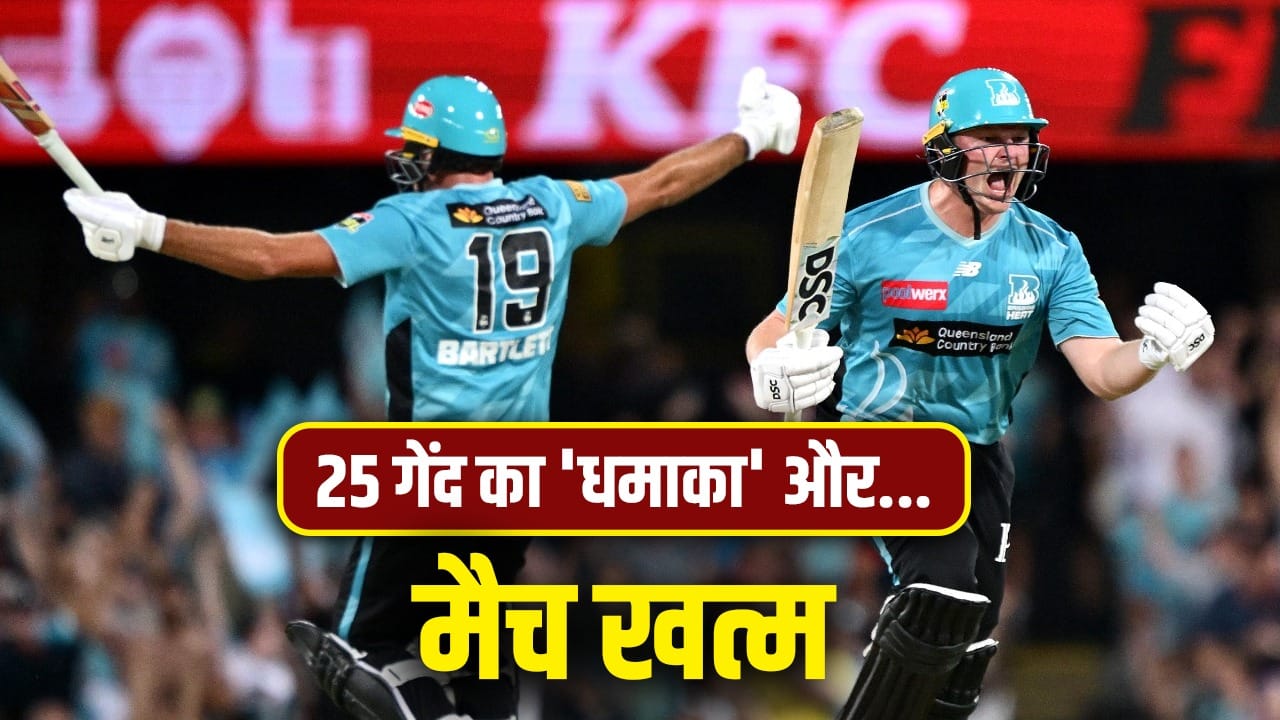 Brisbane Heat vs Melbourne Stars: बिग बैश लीग के 20वें मुकाबले में ब्रिसबेन हीट ने मेलबर्न स्टार्स को 4 विकेट से हरा दिया. गाबा में खेले गए इस मुकाबले में मेलबर्न की टीम 20 ओवर में 195 रन बनाए, जवाब में ब्रिसबेन ने 2 गेंद पहले लक्ष्य हासिल किया. दिलचस्प बात ये है कि एक वक्त ऐसा था जब ब्रिसबेन की टीम एकतरफा हार की ओर बढ़ रही लेकिन इसके बाद 8वें नंबर पर उतरे जेवियर बार्टलेट ने अपनी ताबड़तोड़ बैटिंग से मैच पलट दिया. उन्होंने मैक्स ब्रायंट के साथ मिलकर महज 25 गेंदों में मेलबर्न स्टार्स के होश उड़ा दिए.