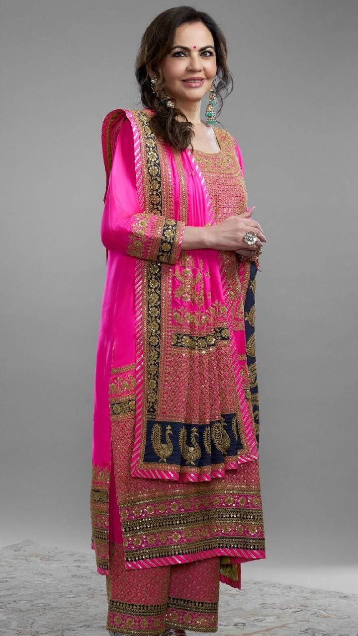 Neeta Ambani wore Sangeeta Kilachand’s Pink Kutch Marodi Embroidery Suit. The suit worn at the Dandiya Festival uses gold zari and coble stitch.