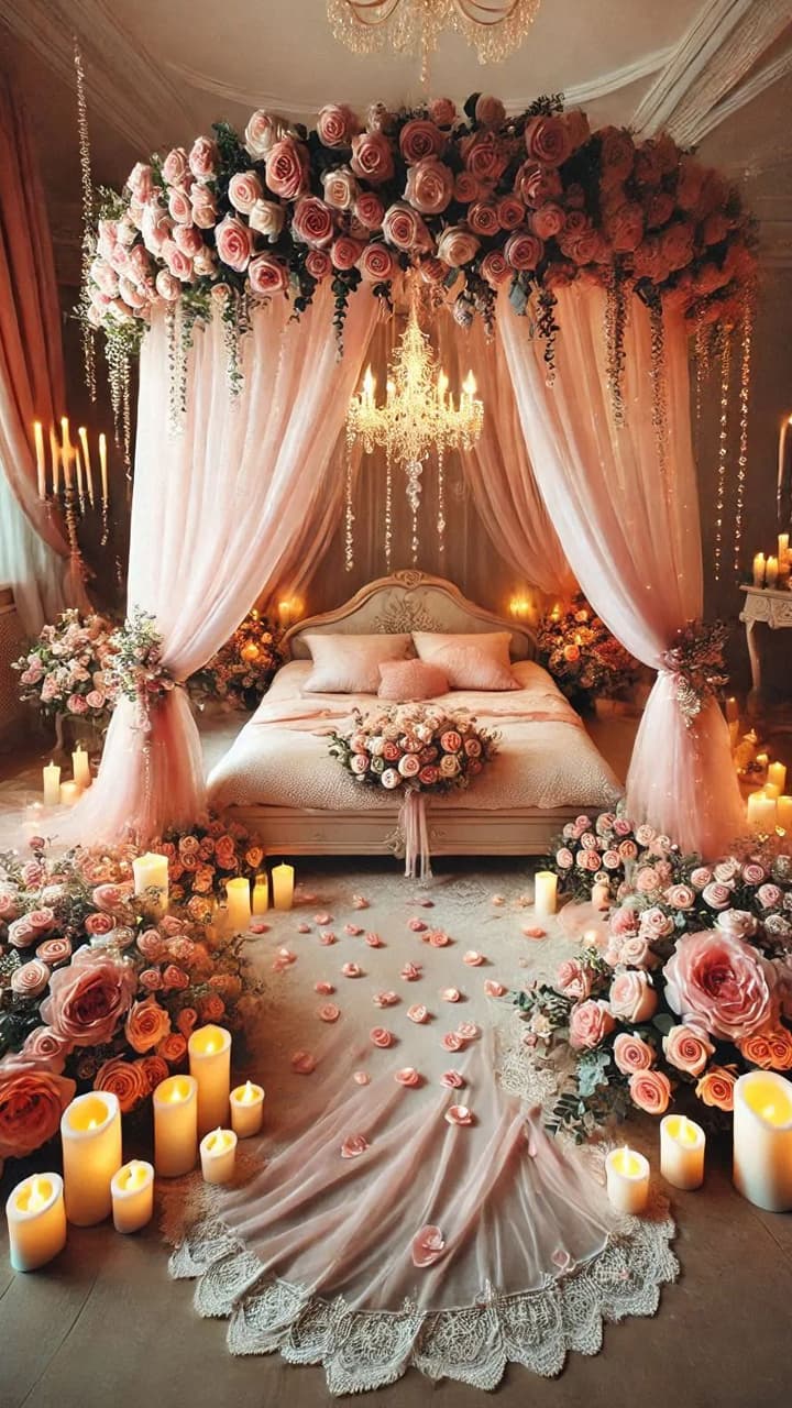 Decorated with sea green sheer net curtain, this canopy bed gives a very soft and royal look. This design gives the bedroom an elegant, cozy and hotel-like luxury feel.