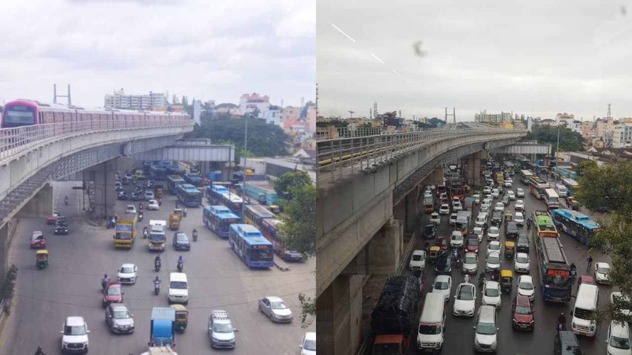 A viral post shows Bengaluru roads during Dasara calm compared to post-holiday traffic chaos. While streets were unusually empty during the festival, congestion returned as offices reopened, highlighting the city’s ongoing traffic.