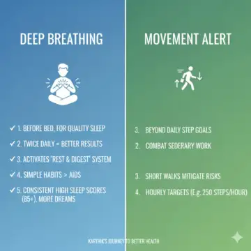 5. By incorporating deep breathing exercises into his daily routine, Karthik shared he achieved consistently high sleep scores (85+), increased frequency of dreams (REM sleep), and woke up feeling refreshed.