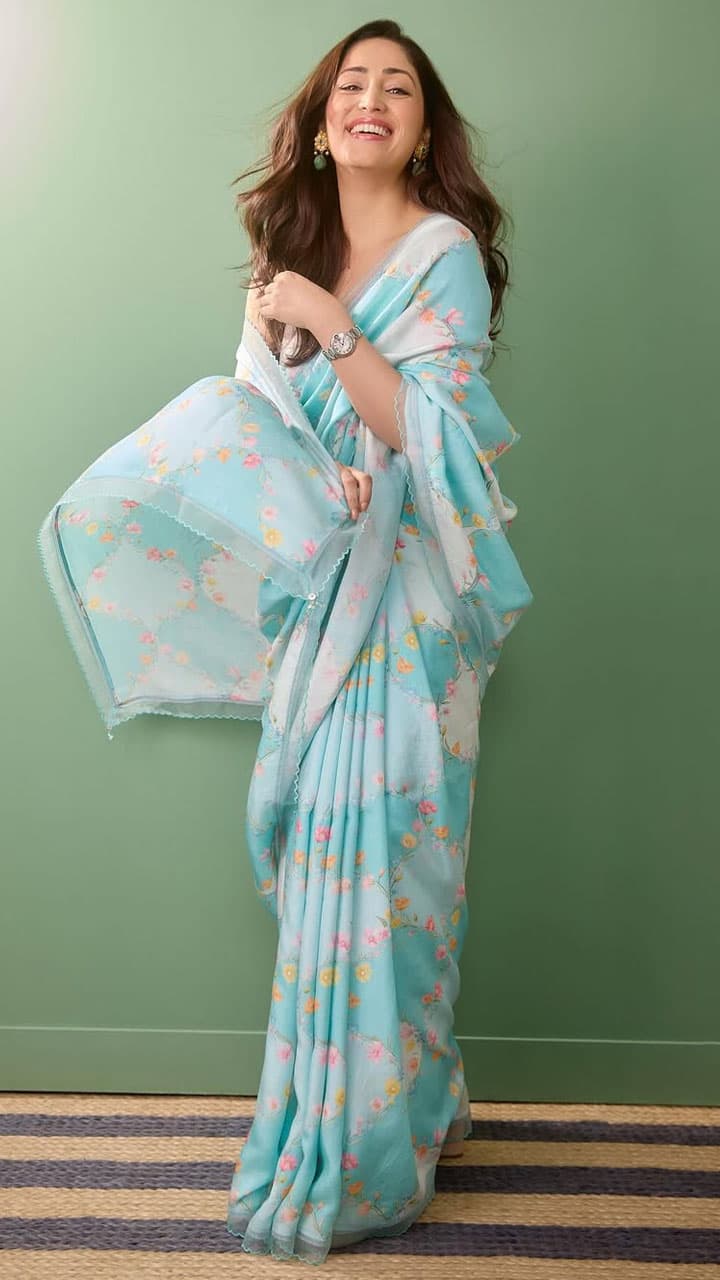 If you want a classy look then this look of Yami Gautam would give the purest Indian vibe. Made of light cotton, thin border and without over-prints, this plain solid color saree is perfect for daily wear and office.