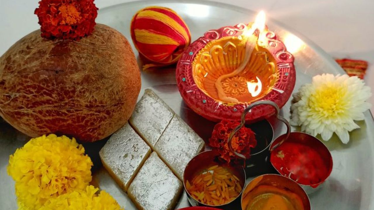 The puja thali represents blessings and positive energy. It includes items like vermilion and rice grains, a lamp (diya), sweets and fruits, coconut or betel leaf, and flowers.