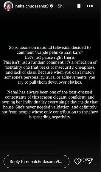 Nehal’s team shared a long note on her Instagram story which read, “So someone on national television decided to comment ‘Kapde pehnke baat karo’ Let’s just pause right there. This isn’t just a random comment, it’s a reflection of mentality one that reeks of insecurity, cheapness, and lack of class. Because when you can’t match someone’s personality, aura, or achievements, you try to pull them down over clothes. Nehal has always been one of the best-dressed contestants of this season elegant, confident, and owning her individuality every single day inside that house. She’s never needed validation, and definitely not from people whose only contribution to the show is spreading negativity.”