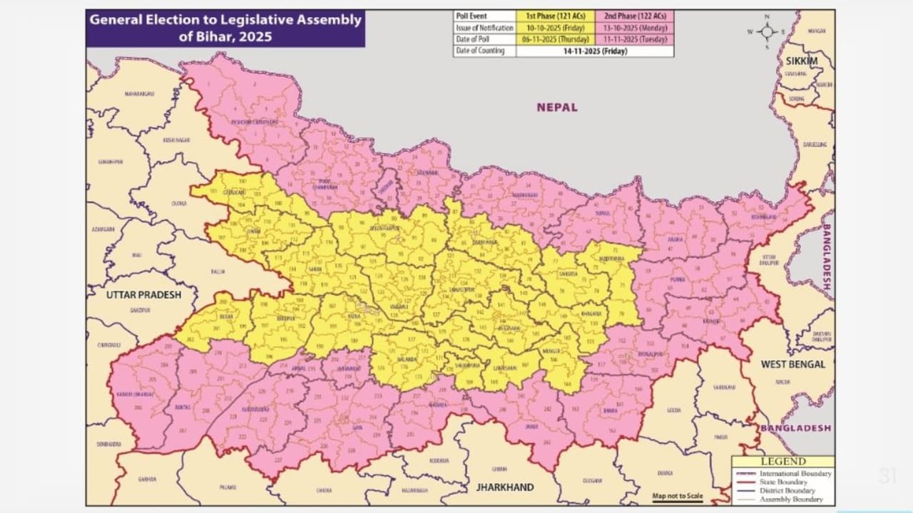The dates of Bihar Assembly Elections 2025 have been announced. Voting will be held on 6 November and 11 November in two phases. The results will be announced on 14 November with counting.