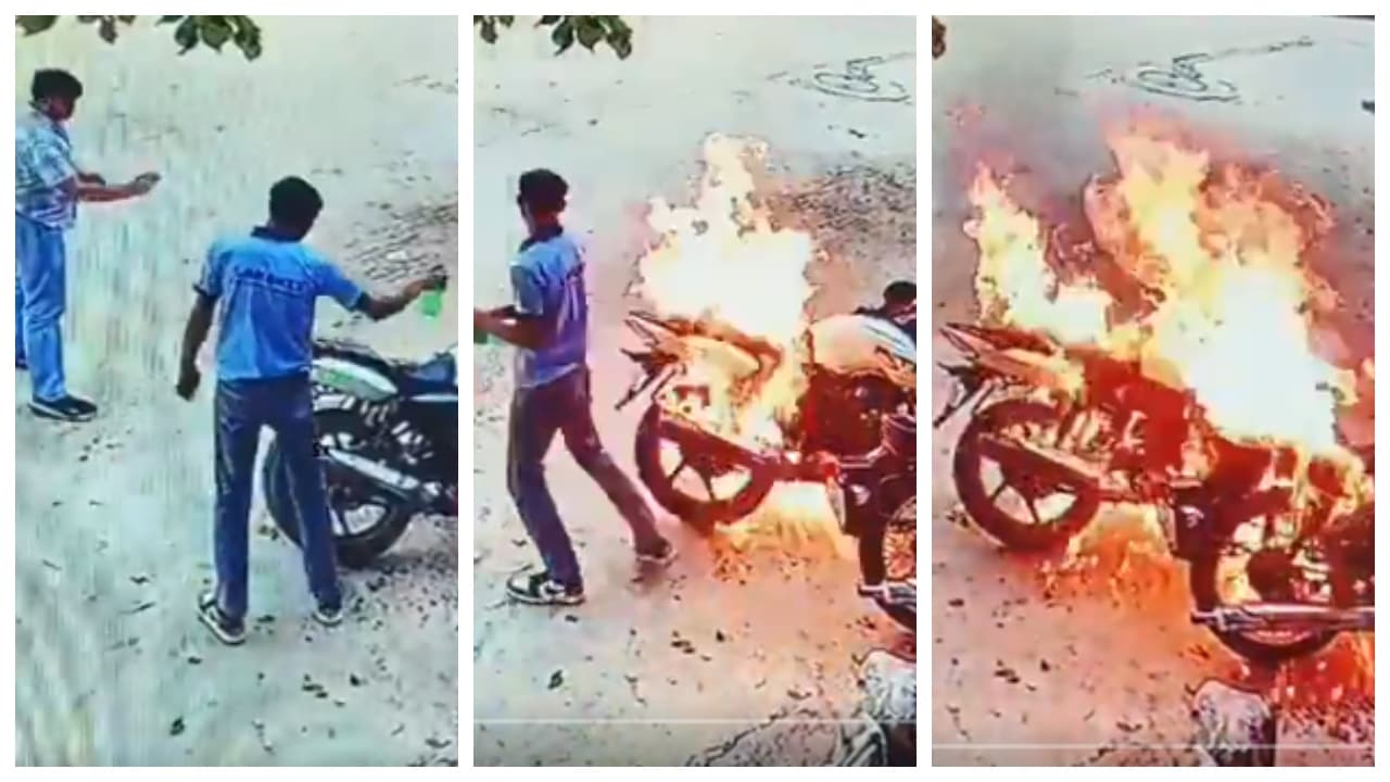 This entire incident was captured in the CCTV installed in front of the house. In the footage, it is seen that a Bullet is seen outside the house and an Apache bike is parked nearby. Just then, two people wearing blue pants and shirts come from the other side. One of them quickly moves forward and pours some liquid from his bottle on both the bikes. After this, another person comes forward and lights the matchbox and throws it away, causing both the vehicles to catch fire. Immediately after this both of them run away from there.