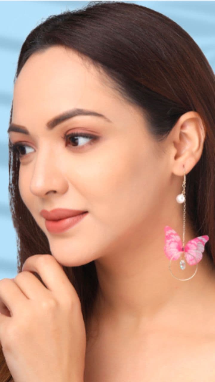 If you like hoop earrings, then you can get this type of hoop earrings in butterfly pattern. The butterfly has beautiful pink sparkle work shining in the golden hoop.