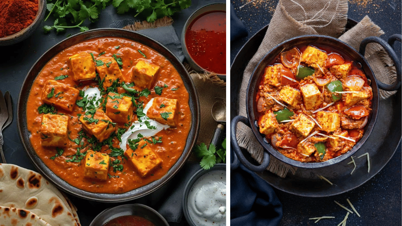 Kadai Paneer: Paneer cubes cooked with bell peppers in a bold, spicy tomato gravy.