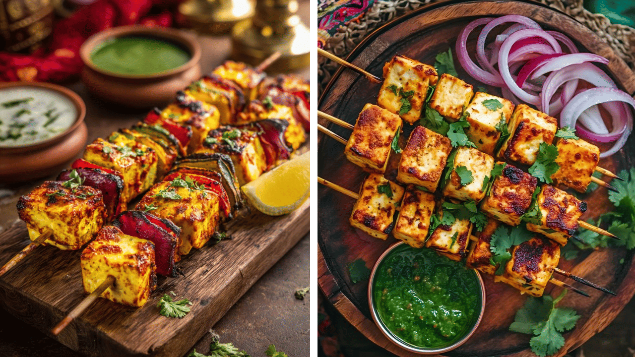 Paneer Tikka: Marinated paneer cubes grilled to smoky perfection, bursting with spices and tang.
