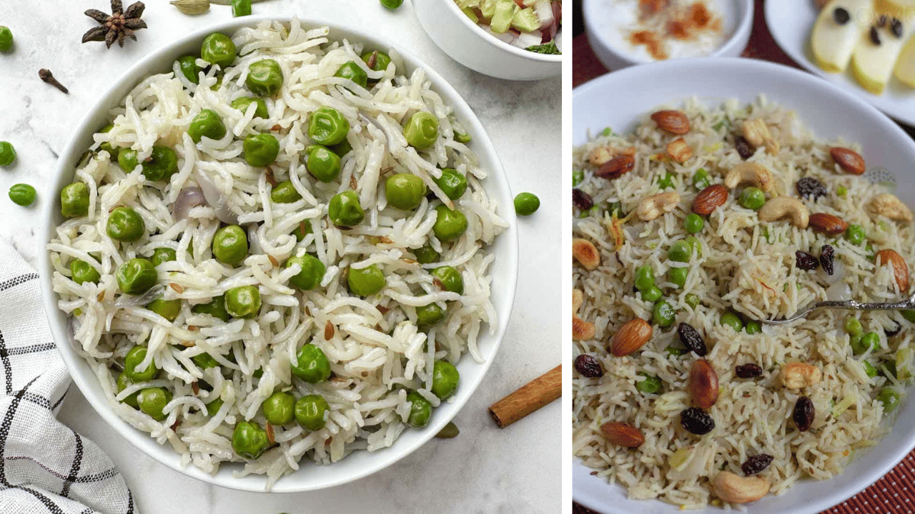 Peas Pulao: Mildly spiced rice cooked with fresh green peas, light yet flavourful.