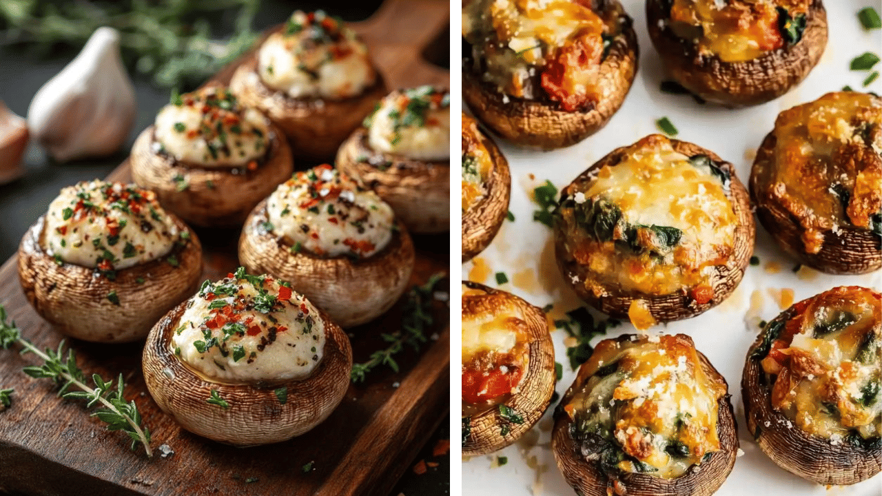 Stuffed Mushrooms: Button mushrooms loaded with cheesy herb filling, baked to savoury delight.