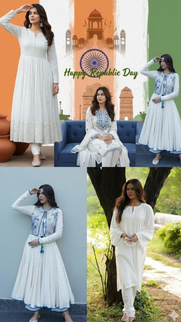 If you want to go to college on Republic Day 2026 but do not have a salwar suit, then buy Off White Purple Print Anarkali Kurta Set. A-line kurti, loose sleeves, juttis and earrings are best for outings.