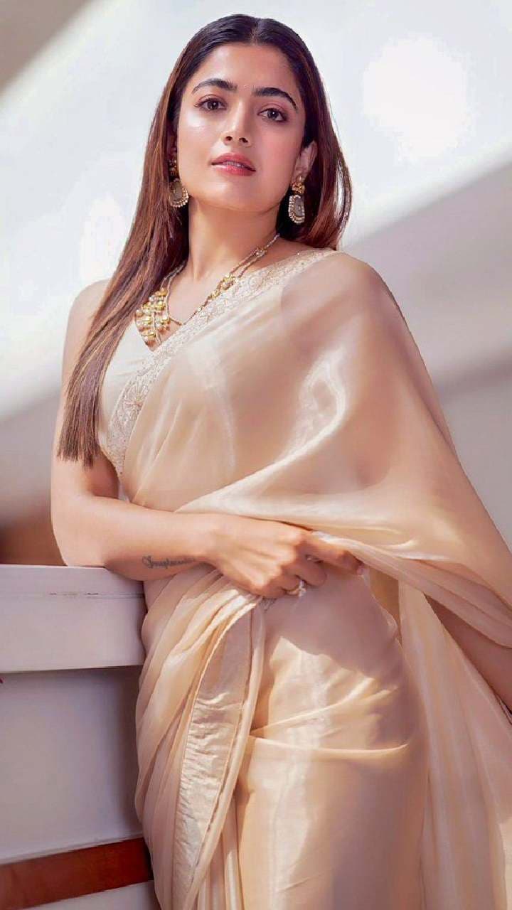 Rashmika’s pastel saree look looks very soft and elegant. With light colors and minimal jewellery, this style makes a perfect choice for young girls.