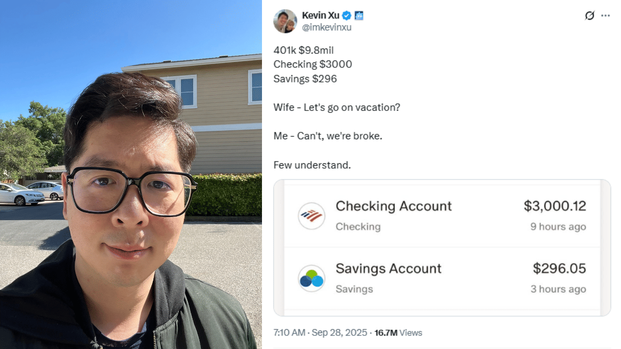 In a now-viral post that has racked up more than 16 million views, Xu broke down his finances in stark terms. “401k $9.8mil. Checking $3000. Savings $296. Wife – Let’s go on vacation? Me – Can’t, we’re broke. Few understand,” he tweeted.