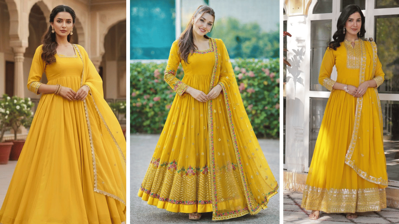Embrace yellow for stability and fresh starts with a flowing Anarkali suit in mustard silk, featuring subtle zari borders for elegance during Ghatasthapana. Style it with layered gold bangles, jhumkas, and a matching dupatta loosely draped; pair with mojari flats for comfortable puja, ensuring breathability in spring warmth.