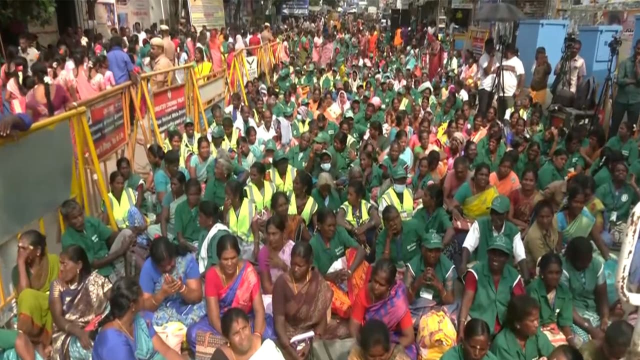 Over 500 sanitary workers, led by the Tamil Nadu Rural Development Department Workers’ Union, protested in Chennai. They demand COVID incentives and salary hikes. The government has accepted some demands, but workers will continue their protest.