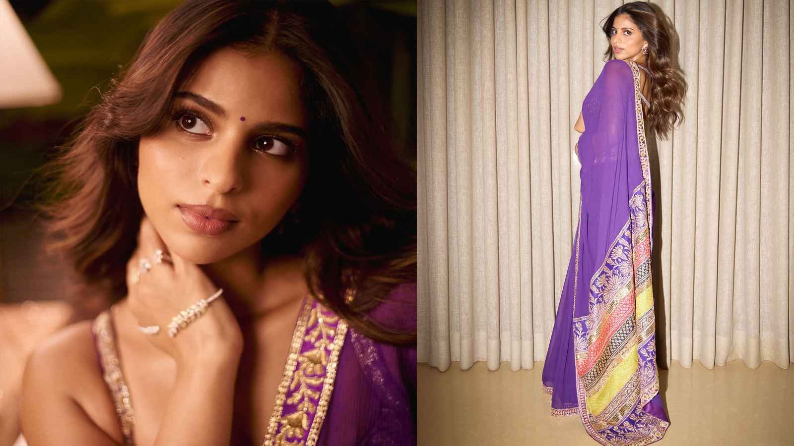 Suhana Khan Saree Designs: As soon as Diwali arrives, there is an outpouring of fashion in Bollywood. The Diwali party started at Manish Malhotra’s house and ends on the day of Diwali at the houses of different celebs. During this time, the beauties of B-Town are seen making waves wearing designer ethnic wear. Be it saree or lehenga, her look is worth seeing. Many actresses follow trends. One name in this is Suhana Khan. She came to Manish Malhotra’s Diwali party wearing a purple colored saree. This color was suiting her very well. This color has been quite in trend in the year 2025. Let us tell you about this purple saree and blouse look of Shahrukh Khan’s darling.