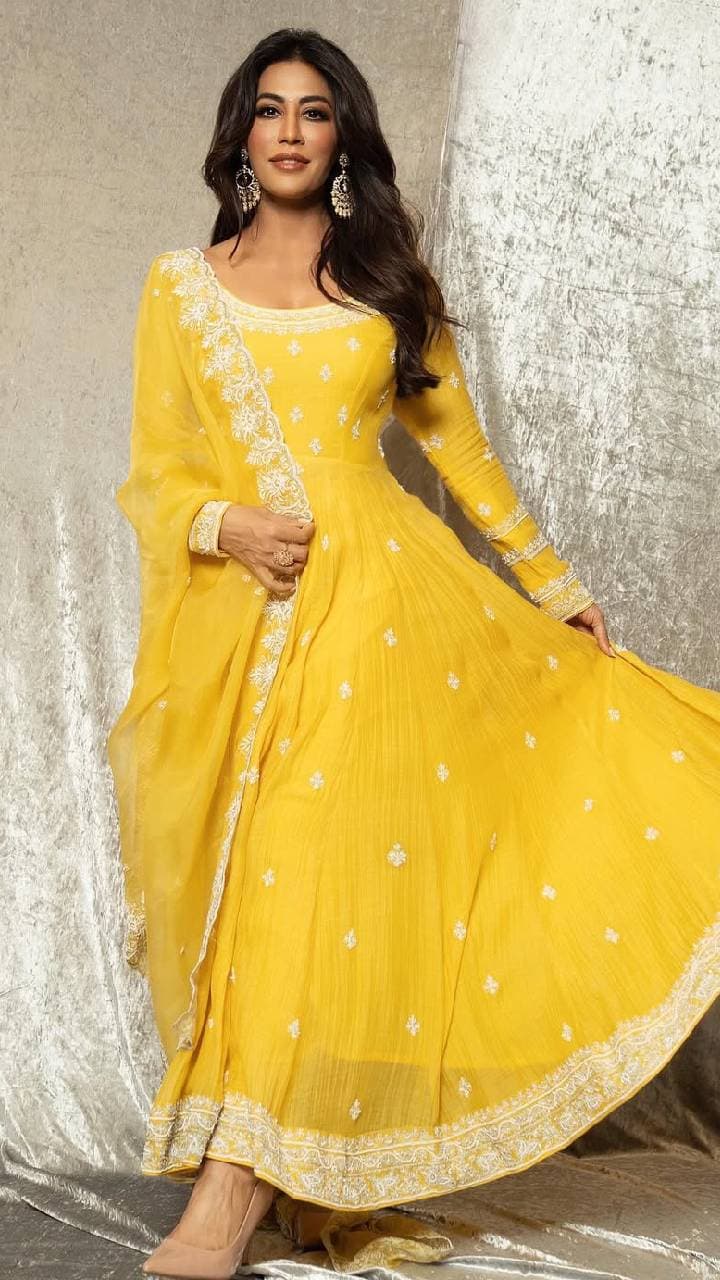 The yellow suit with chikankari in the neckline is shining brightly. Same work has been done in the bottom of Anarkali suit also. You should also try such suits in summer.