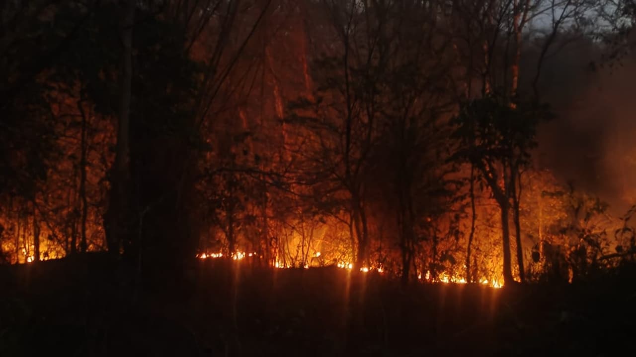 A massive wildfire has been raging for two days in the Muthodi forest range of Chikkamagaluru, destroying vegetation and threatening wildlife in the nearby Bhadra Wildlife Sanctuary as dry leaves and grass fuel the rapidly spreading blaze.