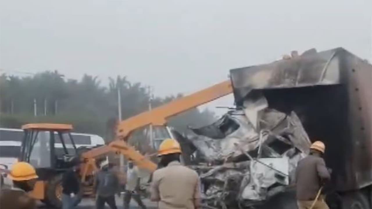 Several people died after a container truck rammed a private bus on NH 48 in Chitradurga, Karnataka. The truck reportedly jumped the divider and collided with the bus. One person is hospitalized with burns. CM Siddaramaiah announced compensation.