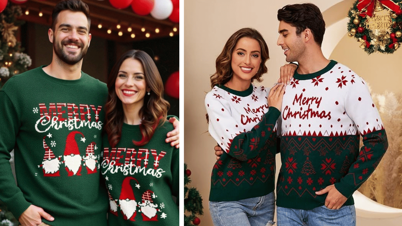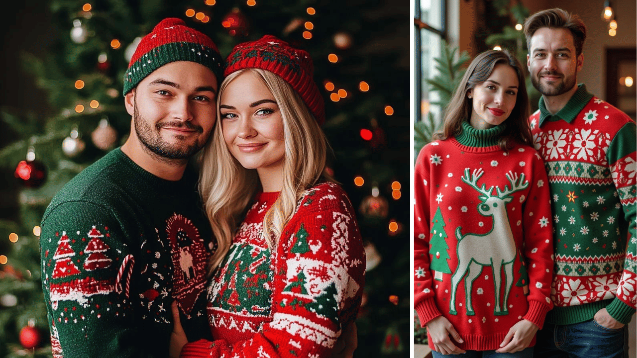 Embrace the best Christmas look with ugly Christmas sweater duos featuring playful reindeer or snowflakes – hers cropped over jeans, his full-length with chinos. Ideal couple looks for Christmas at home parties, blending comfort and fun for Instagram-worthy moments.