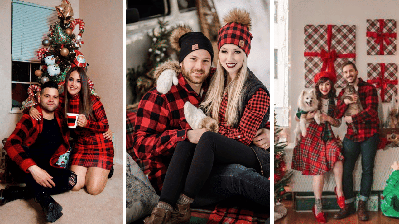 Trendy outfits for Christmas shine through buffalo plaid shirts – hers with a mini skirt, his with corduroy pants and boots. A cozy best Christmas outfit that works for markets or casual gatherings, evoking timeless festive warmth.