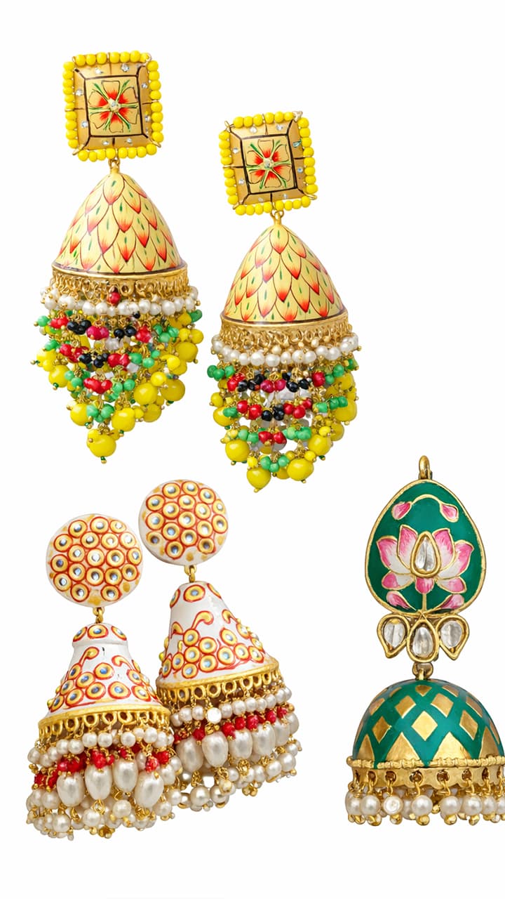 Nowadays this type of earrings are very in trend. It has a small bird design on the top and a red colored Meenakari stone on the bottom, on which intricate carving work has been done.