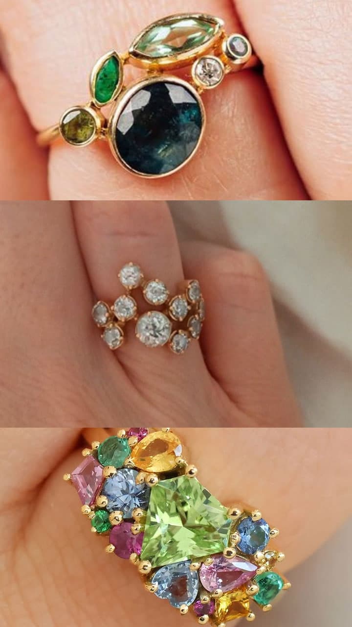 Small stones like diamonds or gemstones are used in cluster rings. It is set in such a way that it looks like a big stone. It is elegant, royal and eye catchy.